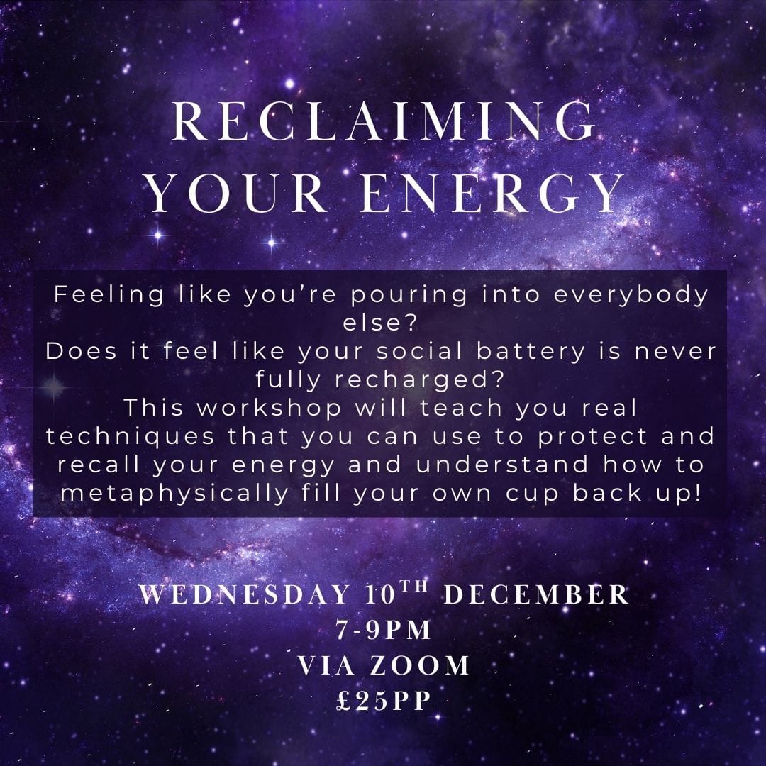 This workshop will teach you real techniques that you can use to protect and recall your energy and understand how to metaphysically fill your own cup back up!